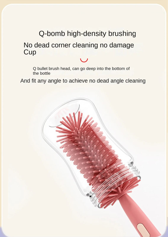 বড় ঘূর্ণায়মান সিলিকন বোতল ব্রাশ: এটি বোতলের ভেতরের গভীরতম কোণায় পৌঁছাতে পারে। এর নরম কিন্তু কার্যকর সিলিকন ব্রিসলগুলো বোতলের দেয়াল এবং নিচের অংশে জমে থাকা দুধ বা খাবারের কণাগুলোকে ঘুরিয়ে ঘুরিয়ে আলগা করে দেয়, যা সাধারণ ব্রাশের পক্ষে সম্ভব নয়। বোতলের কাঁচ বা প্লাস্টিকের উপরিভাগে কোনো আঁচড় পড়বে না, তাই আপনার মূল্যবান বোতলগুলো থাকবে সুরক্ষিত।