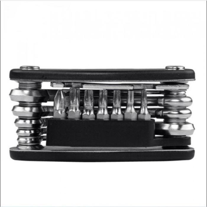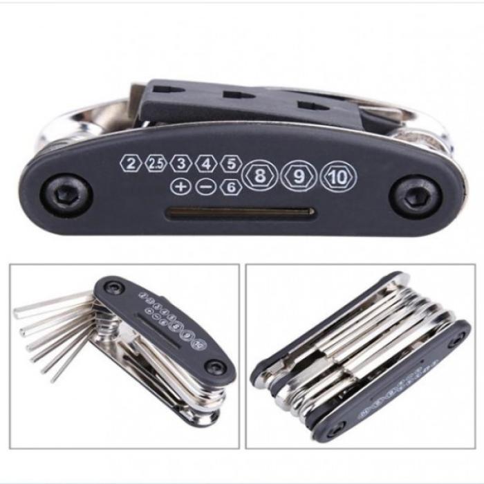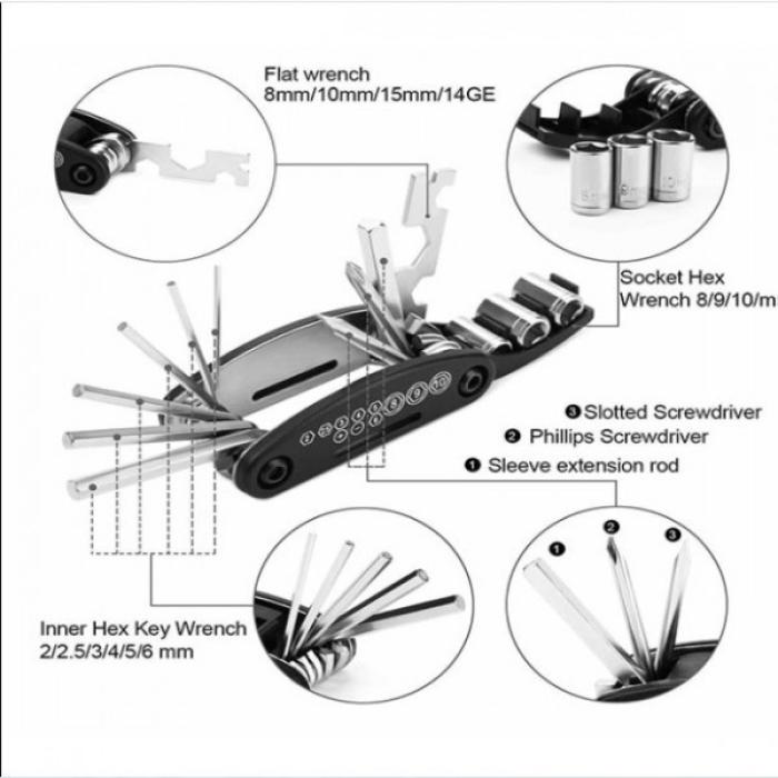 16 function all in one tool: Socket Hex Wrench 8/9/10/mm, Slotted Screwdriver, Phillips Screwdriver, Socket Extension Rod, Solid Wrench 8/10/15/mm, Hex Key Wrench 2/2.5/3/4/5/6mm, Spoke Wrench